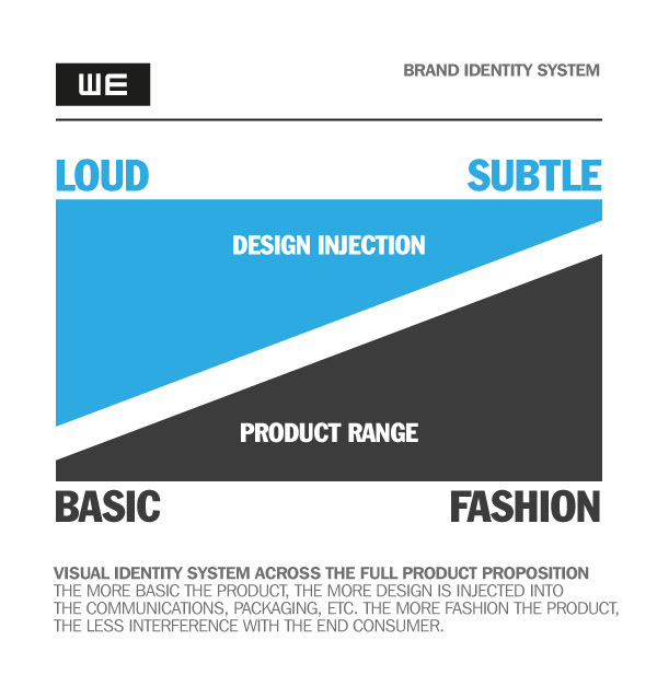WE was perceived as a “well-priced” brand with good basics. Their price positioning allowed them to perform relatively well when the financial crisis hit Europe and WE decided to use that momentum to upgrade their brand and move one level up the fashion scale. The brief was to develop a platform that would allow that shift and an identity to support it.